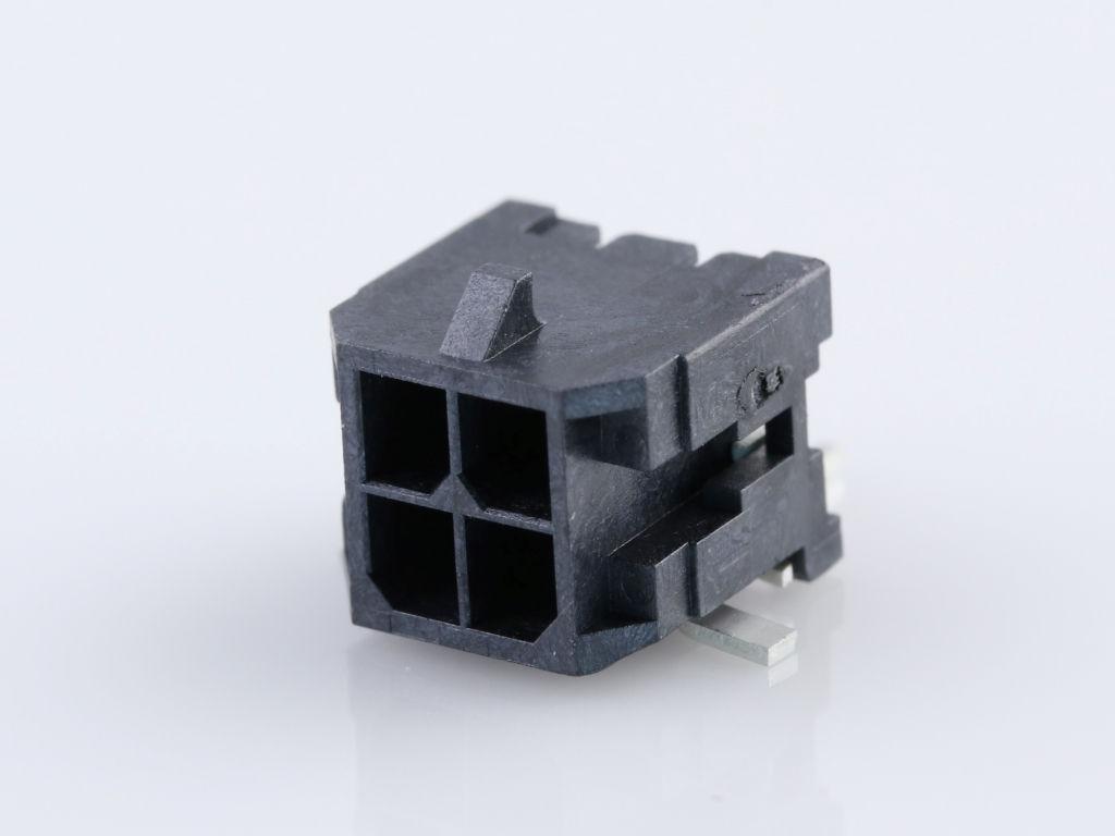 Micro-Fit 3.0 Right-Angle Header, 3.00mm Pitch, Dual Row, 4 Circuits, with Solder Tab, Gold, Glow-Wire Capable, Black, Tape and Reel