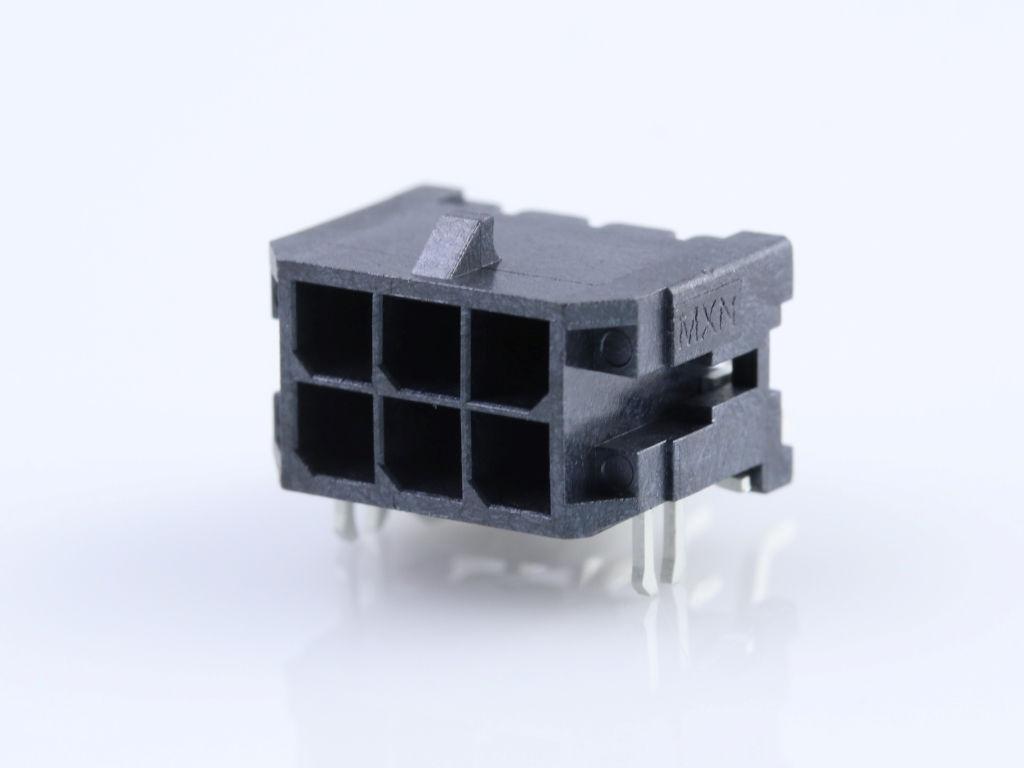 Micro-Fit 3.0 Right-Angle Header, 3.00mm Pitch, Dual Row, 6 Circuits, with PCB Press-fit Metal Retention Clip, Tin, Glow-Wire Capable, Black, Tape and Reel