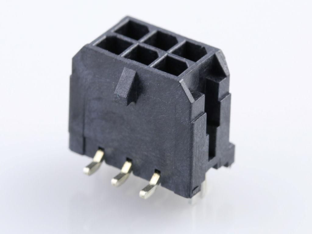 Micro-Fit 3.0 Vertical Header, 3.00mm Pitch, Dual Row, 6 Circuits, with PCB Press-fit Metal Retention Clip, Tin, Glow-Wire Capable, Black, Tape and Reel