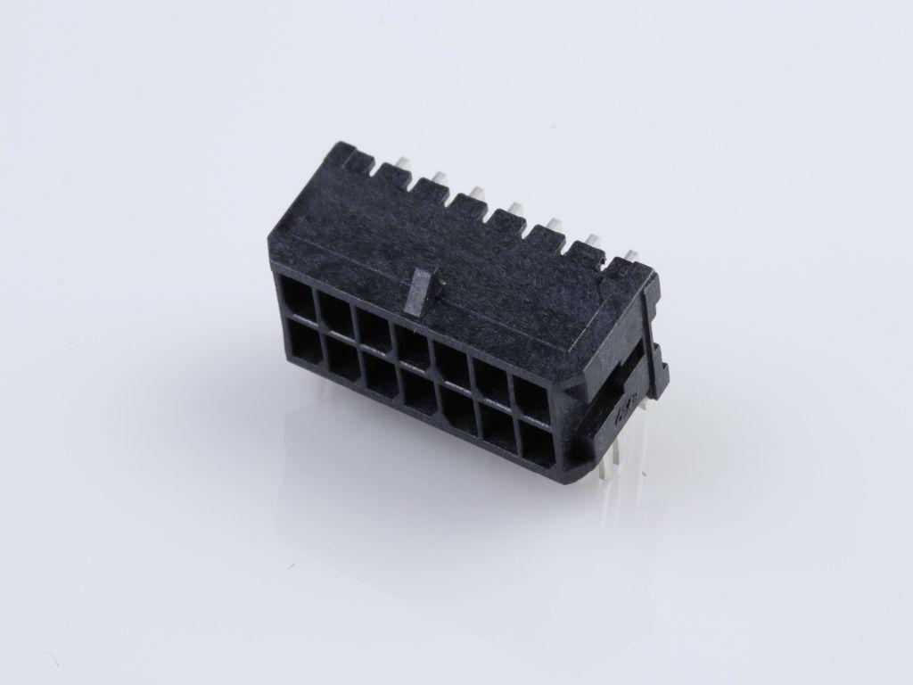 Micro-Fit 3.0 Right-Angle Header, 3.00mm Pitch, Dual Row, 14 Circuits, with PCB Press-fit Metal Retention Clip, Tin, Glow-Wire Capable, Black