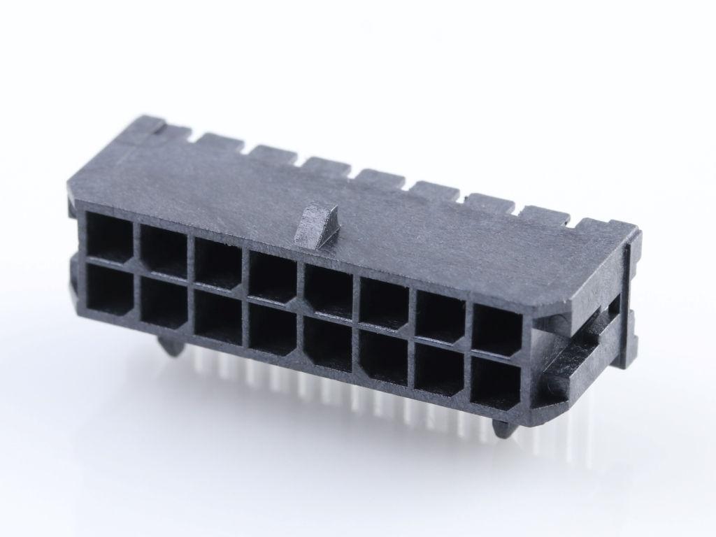 Micro-Fit 3.0 Right-Angle Header, 3.00mm Pitch, Dual Row, 16 Circuits, with Snap-in Plastic Peg PCB Lock, Tin, Glow-Wire Capable, Black