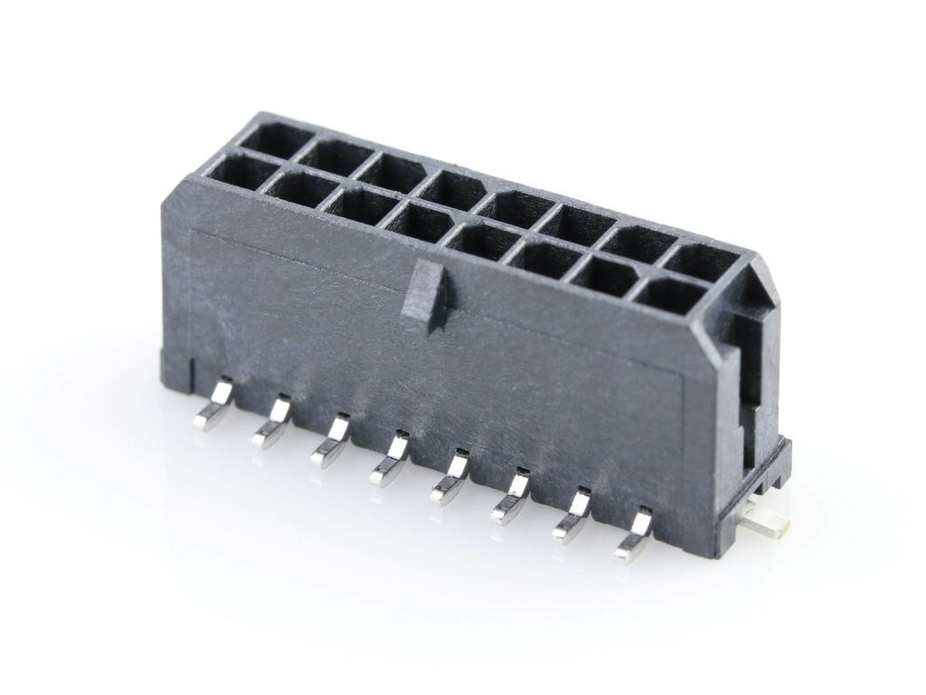 Micro-Fit 3.0 Vertical Header, 3.00mm Pitch, Dual Row, 16 Circuits, with Solder Tab, Tin, Glow-Wire Capable, Black, Tape and Reel