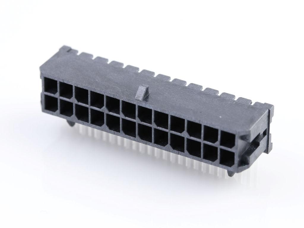 Micro-Fit 3.0 Right-Angle Header, 3.00mm Pitch, Dual Row, 24 Circuits, with Snap-in Plastic Peg PCB Lock, Gold, Glow-Wire Capable, Black