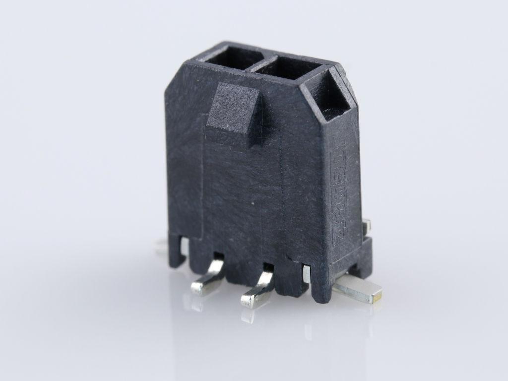 Micro-Fit 3.0 Vertical Header, 3.00mm Pitch, Single Row, 2 Circuits, with Solder Tab, Gold, Glow-Wire Capable, Black, Tape and Reel