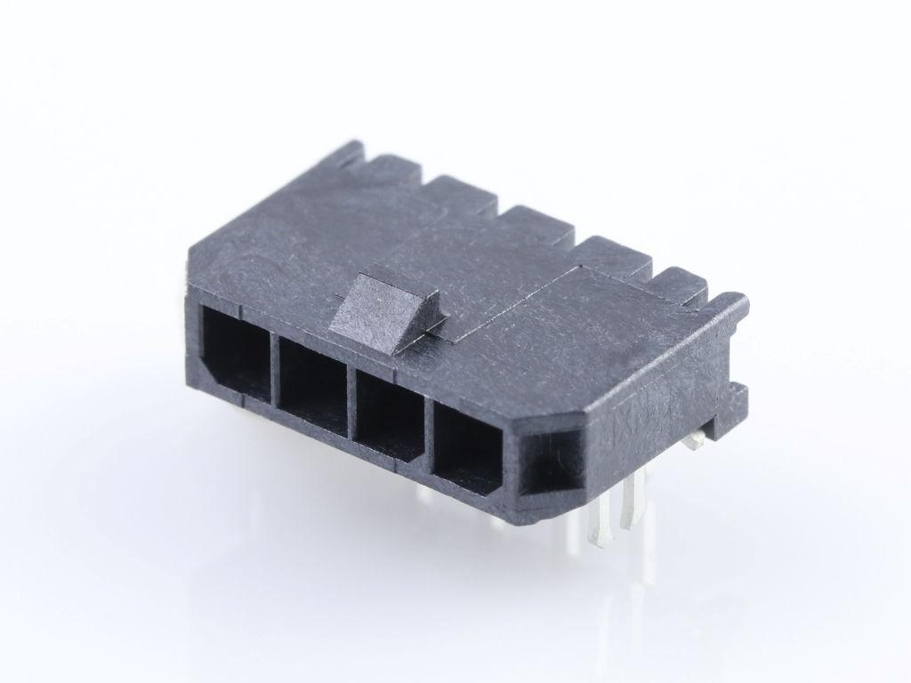 Micro-Fit 3.0 Right-Angle Header, 3.00mm Pitch, Single Row, 4 Circuits, with PCB Press-fit Metal Retention Clip, Tin, Glow-Wire Capable, Black