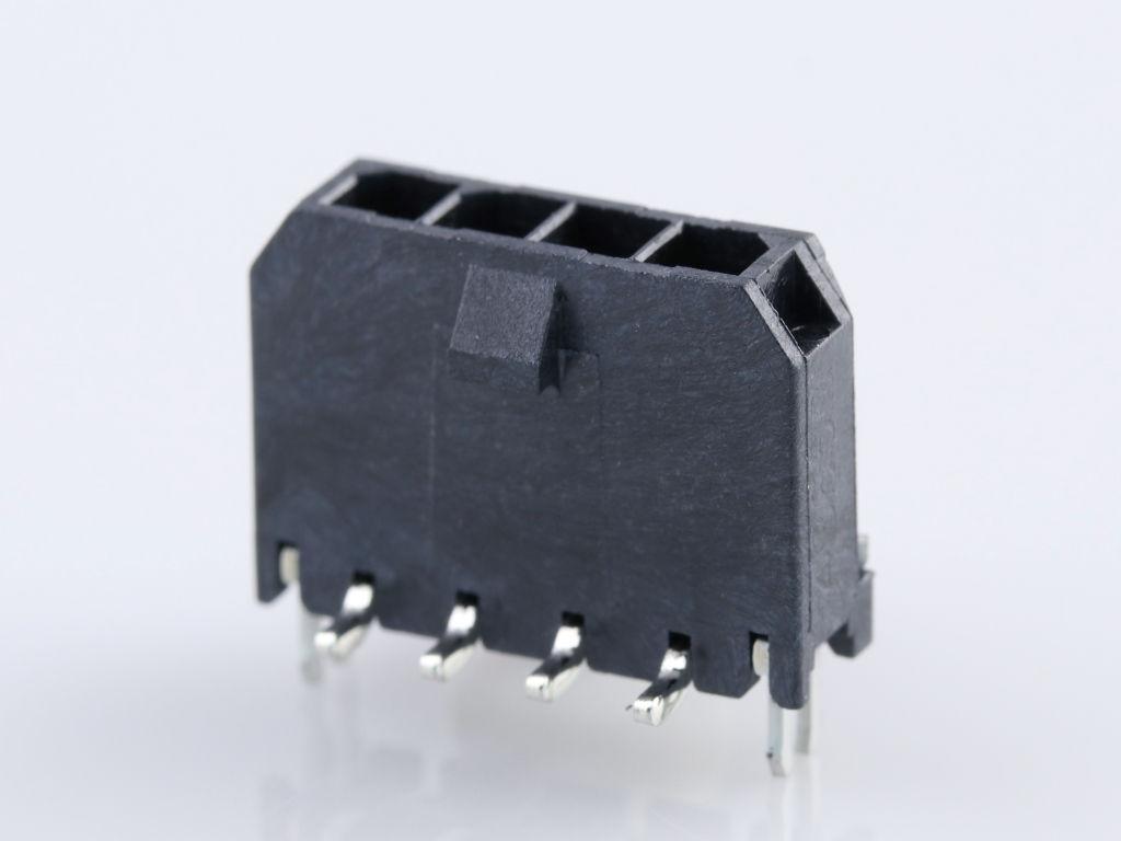 Micro-Fit 3.0 Vertical Header, 3.00mm Pitch, Single Row, 4 Circuits, with PCB Press-fit Metal Retention Clip, Tin, Glow-Wire Capable, Black, Tape and Reel