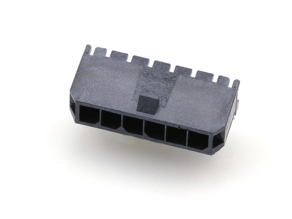 Micro-Fit 3.0 Right-Angle Header, 3.00mm Pitch, Single Row, 6 Circuits, with PCB Press-fit Metal Retention Clip, Tin, Glow-Wire Capable, Black
