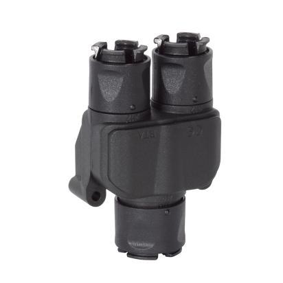 Y-shaped branch in parallel. Nominal diameters input 17mm 2 outputs 12mm. Black color. Material PA6.6 UL94V0 halogen-free and flame-retardant.
