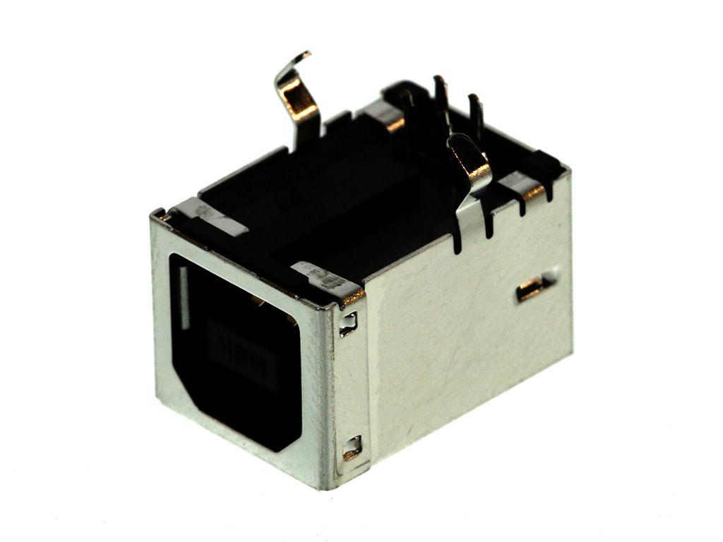 Universal Serial Bus (USB) Shielded I/O Type B Receptacle, Right-Angle, with Kinked Solder Tabs, Color Black, Gold (Au) Flash Plating, Tray Pack, Lead-Free