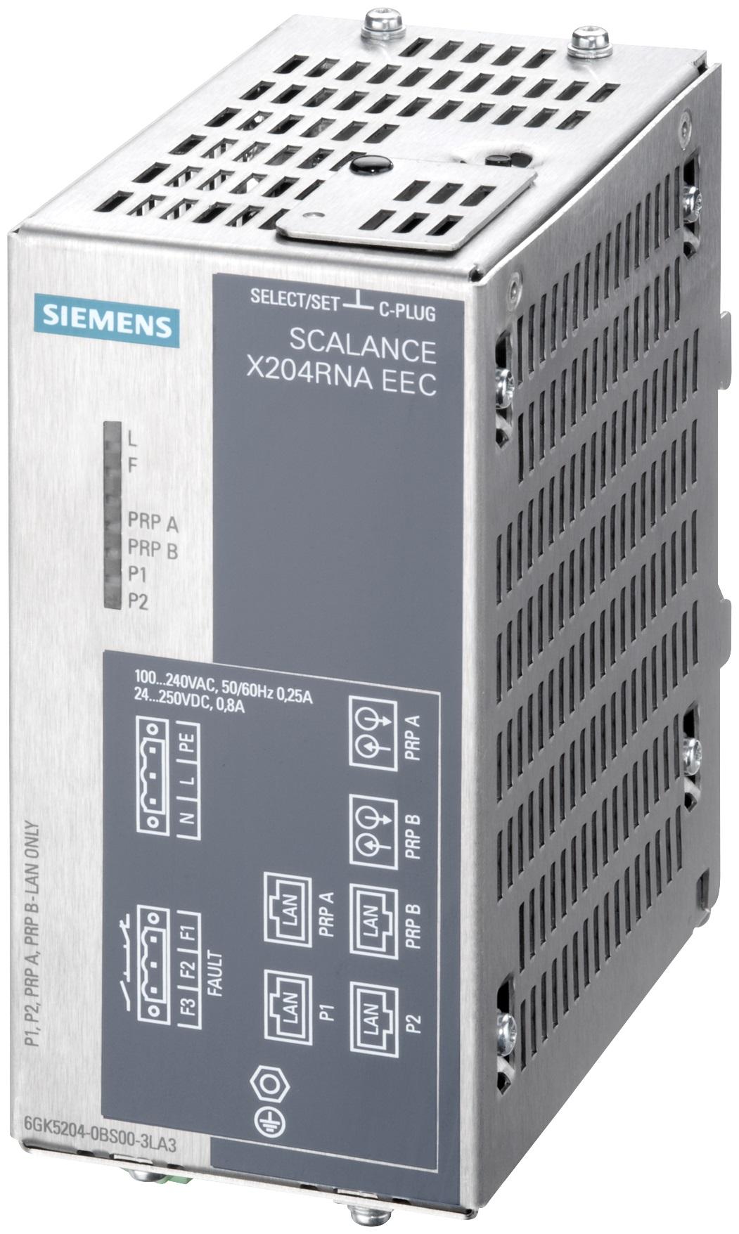 SCALANCE X204RNA EEC; redundant network access 2x 100 Mbit/s RJ45 ports; 2x 100 Mbit/s combo ports; LED diagnostics; error signaling contact with set pushbutton; simple power supply; network management; including electronic manual on CD-ROM, C-PLUG optional for PRP network