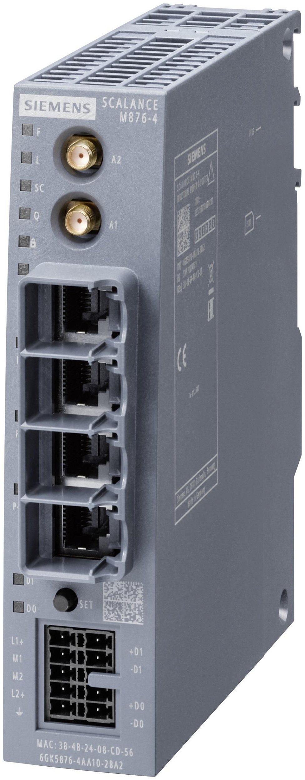 SCALANCE M876-4 4G router; for wireless IP communication from Ethernet-based programmable controllers via LTE (4G) mobile radio optimized for worldwide usage, VPN, firewall, NAT; 4-port switch; 2x SMA antennas, MIMO technology; 1x digital input, 1x digital output; observe national approvals.