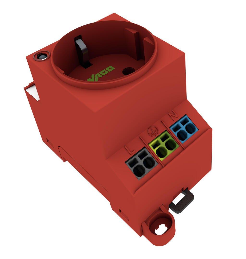 Switch cabinet socket for screw and DIN rail mounting for common CEE 74 Schuko F-type plug in DE NL AT with LED status display With double connection Cage Clamp type Pushin red