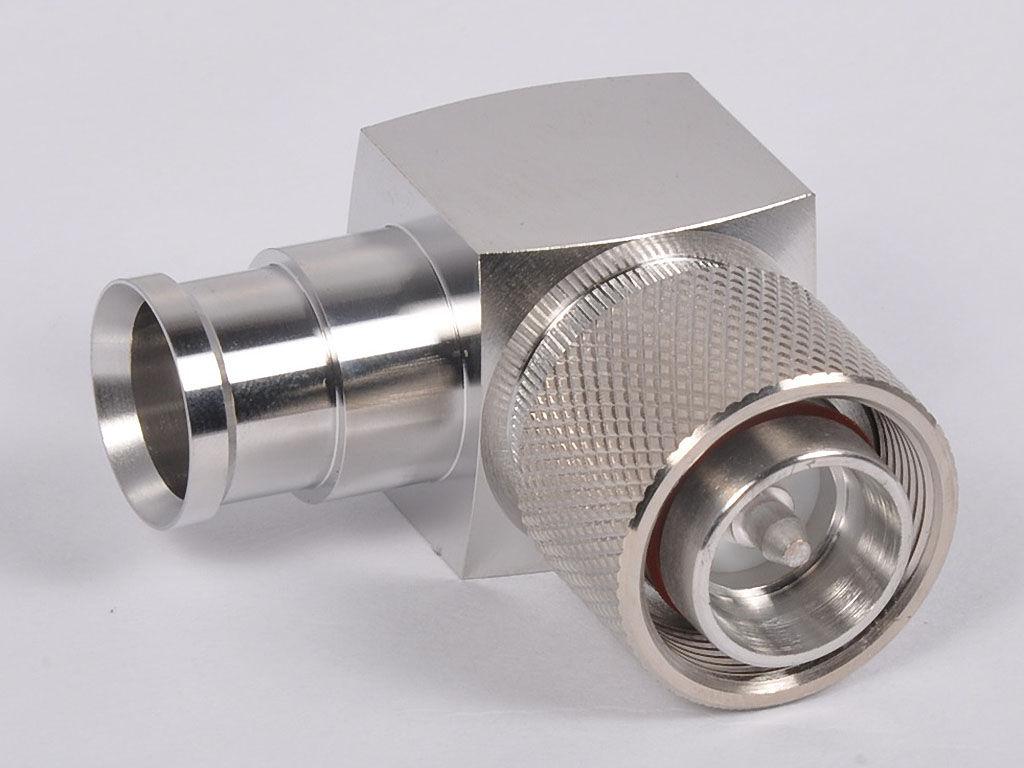 50 Ohms, 4.3-10 Plug, Right-Angle, Hand Tight, for 1/2" Super Flexible Coaxial Cable, One Piece Per Carton