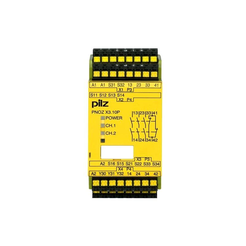 Safety relay (standalone) Inputs: 1-/2-channel wiring with/without detection of shorts across contacts Outputs: 3 N/O, 1 N/C, 1 semiconductor. Automatic/monitored start UB 24 V AC/DC, width: 45 mm, plug-in spring-loaded terminals. Monitoring E-STOP, safety gates. Sidewards compatibility with PNOZ X3.