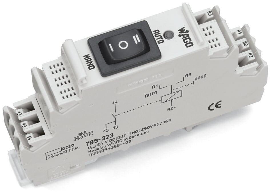 Relay module Nominal input voltage 24 V DC 1 NO contact Continuous current limit 16 A for lamp loads Switch Manual0FFAutomatic Status indicator red Module width 18 mm 250 mm² gray