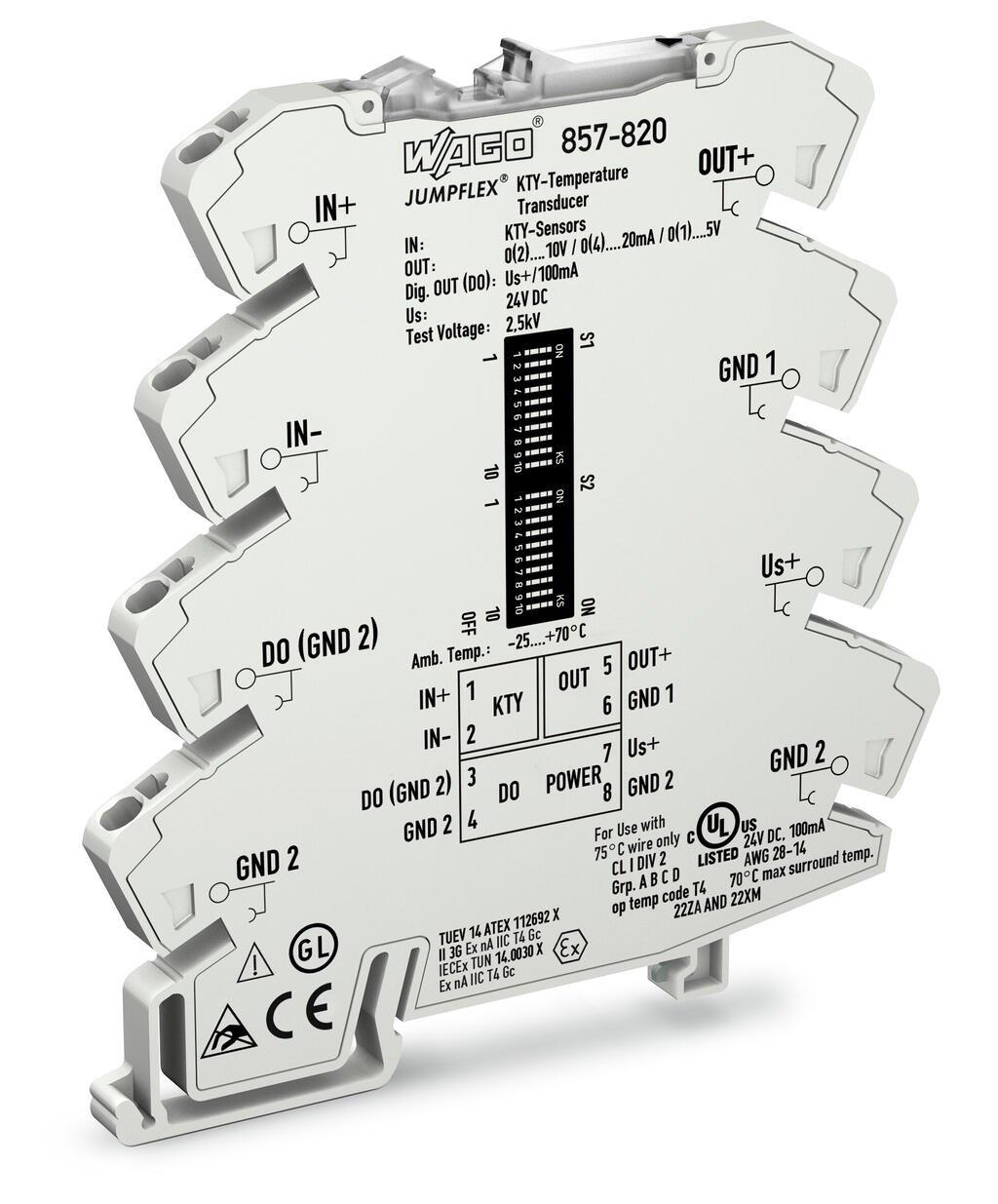 Temperature signal transducer for KTY sensors Voltage and current output signal Configurable via DIP switch Supply voltage 24 V DC Module width 6 mm light gray