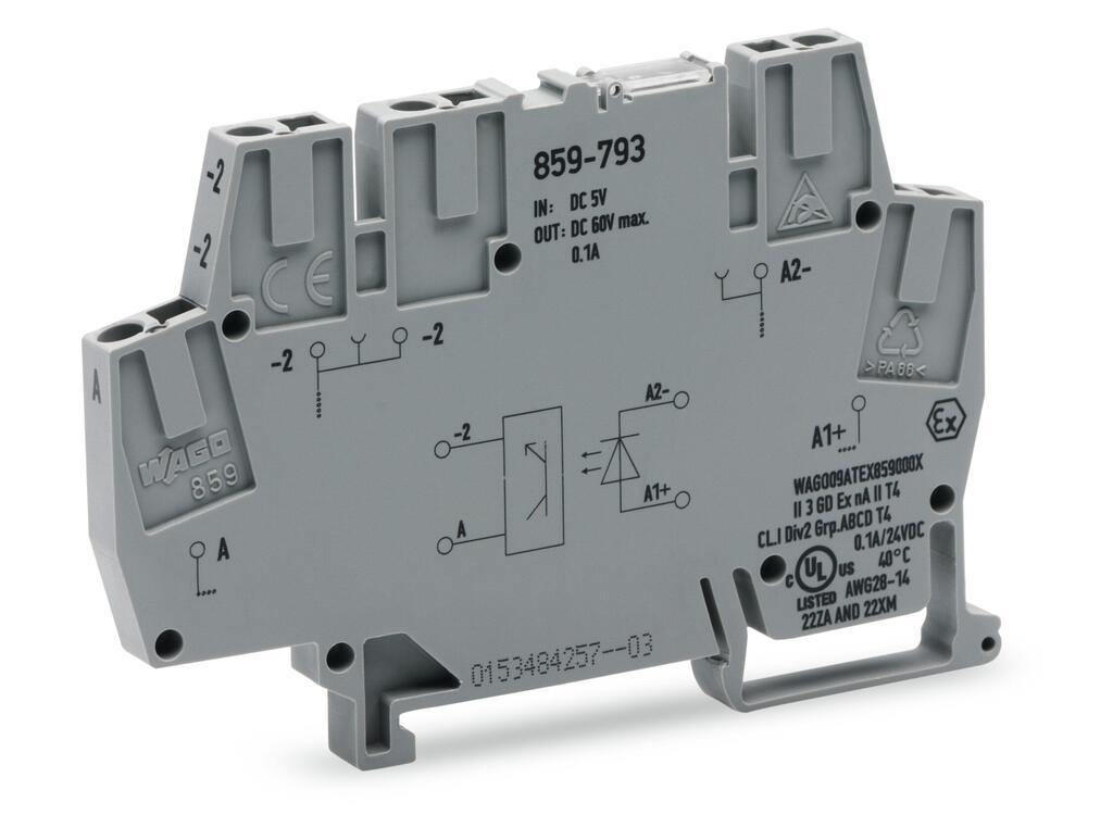 Optocoupler module Nominal input voltage 5 V DC Output voltage range 3 to 60 V DC Continuous current limit 01 A 2-wire connection Railway Module width 6 mm gray