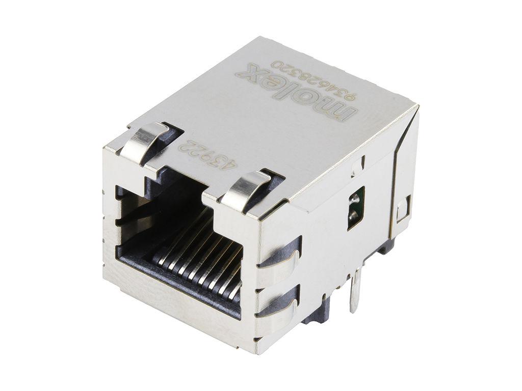 MXMag Fast Ethernet 4 Core Non-PoE Single-Port RJ45 Connector, 21.40mm Depth, 3.30mm Phy Pin Length, Right-Angle, Inverted Profile, with Shield Tabs, Non-LED, Industrial Temperature, Tray