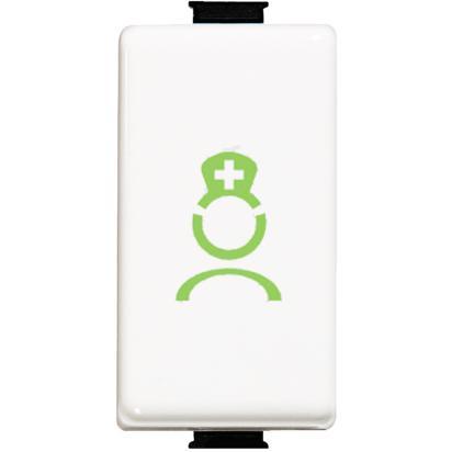 WC call cancellation. Mtix NC button with green colored nurse icon, to be installed in the bathroom attached to the patient room. Must be connected to the room terminal. Allows staff to close a bathroom call, in compliance with VDE standards . Device 1 module civil series.