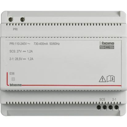 Power supply with input voltage 110 240Vac 50 60 Hz. It provides two safety extra-low voltage supplies at the output one of 27V DC 1.2A on SCS terminals, one of 28.5V DC on terminal 1 2 to be used alternately and NOT simultaneously. It can also be used as an additional power supply output 1 2 for local supply of automation devices in this case no other output can be used. The device electronically protected against overload and short-circuit. a double-insulation SELV safety device Footprint 6 DIN modules.
