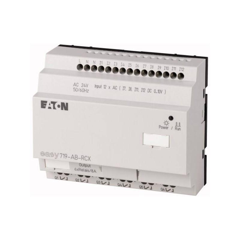 Expandable electronic control relay, Rated operating voltage 24VAC, 12 digital inputs 24 VDC, 4 inputs can be used as analogue inputs, 6 relay outputs, without having a keyboard, without LCD display, timer, easyLink, can be expanded with digital inputs and outputs, can be extended to the Bus system AS-Interface, PROFIBUS-DP, CANopen, DeviceNet, individual labelling of the control relay by the label software label editor, delivery of the control relay with the user program is possible