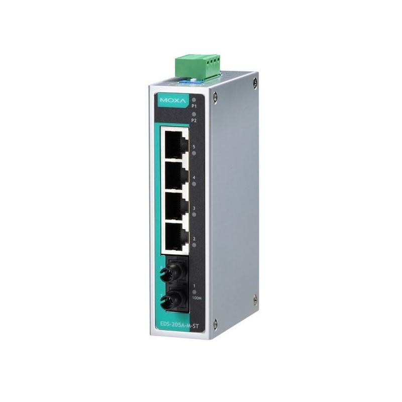 Unmanaged Ethernet switch with 4 10/100BaseT(X) ports, 1 100BaseFX multi-mode port with ST connectors, -40 to 75C operating temperature