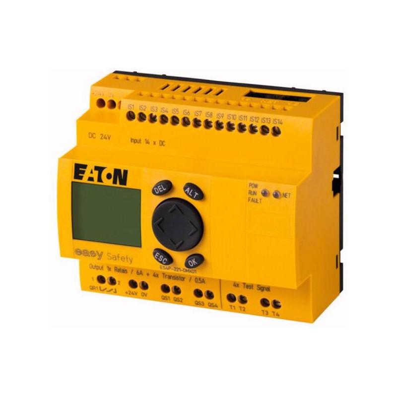 Expandable safety-related control relay, Rated operating voltage 24 VDC, 14-safe digital inputs, 1 safe as well as redundant relay output 6 A, 4 transistor outputs 0.5A, 4 test signal outputs, suitable for Category 4 according to EN 954-1/PL e according to EN ISO 13849-1/SILCL3 in accordance with IEC 62061/SIL 3 according to IEC 61508, protection class IP 20, keyboard, LCD display, safety and standard functionality integrated into a device, bus system easyNet on board, easyLink, can be expanded with digital inputs and outputs, expandable via bus module to the Bus system AS-Interface, PROFIBUS-DP, CANopen, DeviceNet, individual labelling of the control relay by the label software label editor