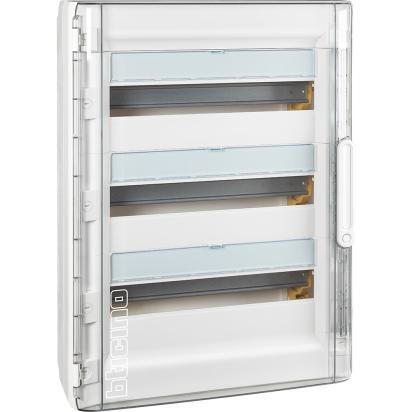 Wall-mounted switchboard with transparent door, 54 modules DIN35 3x18 600x450x150mm. Compliance with IEC 6067024 , CEI 2348 , CEI 2349, CEI 614393 standards.Degree of protection IP40 and IK07. Thermoplastic resin material. Insulation class II. Wall box in white RAL 9003 finish. 1060C deployment temperature. Abnormal heat and fire resistance EN 60695211 650C. Profile type DIN35 Galvanized steel. Predetermined pre-fractures for diameter1632mm tubes. Reversible hatch opening.