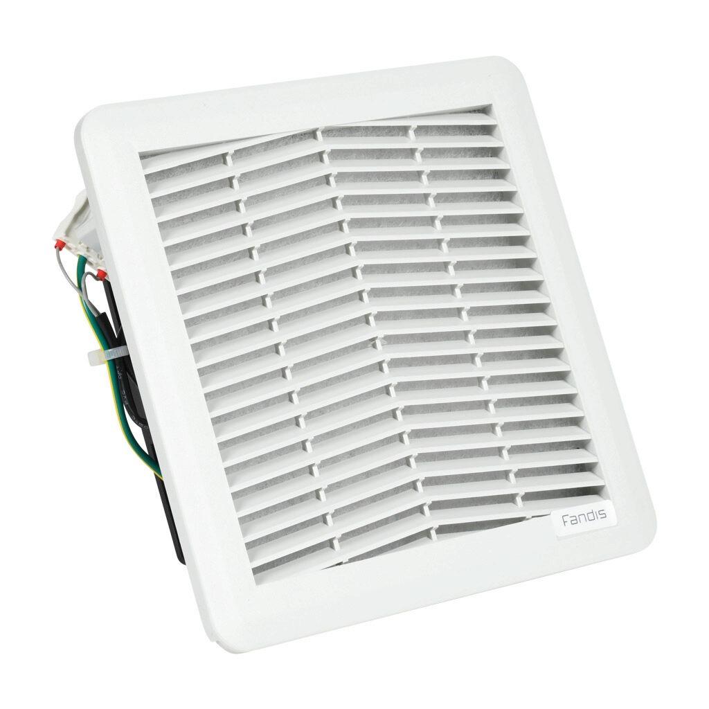 intake fan, side mount, 65 CFM, 115 VAC operating voltage, G3 (coarse) filter mat, NEMA 12, indoor use only, 6.97 x 6.97in enclosure cutout, RAL 7035 light gray.