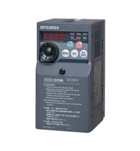 Variable Speed/Frequency Drive (VSD/VFD) / Inverter - US/CA/MX specification - Mitsubishi Electric (FREQROL FR-D700 series) - input 200Vac-240Vac (Single-phase / 1P) - 2.2kW / 3HP - 10A - frequency (output) 0.2-400Hz - with Modbus RTU communication capability - IP20 - input voltage nominal values 220Vac / 230Vac