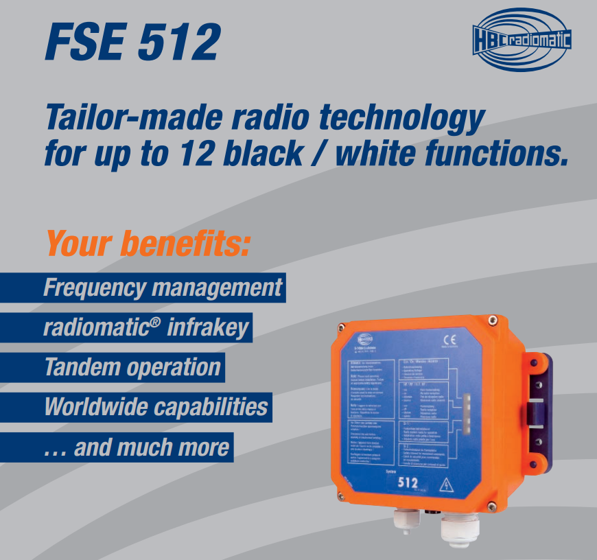 • 12 black / white commands + E-STOP + infrared relay. • E-STOP: PL d, category 3 according to EN ISO 13849-1:2008. • Power supply: 24 – 48 V AC, 42 – 240 V AC (worldwide capabilities). • Robust plastic housing, protection class IP 65. • Dimensions: 165 x 165 x 70 mm (6.5 x 6.5 x 2.8"). • Weight: approx. 1.5 kg (approx. 3.3 lbs.). • Convenient snap-in mounting device. • Further options: catch-release, external antenna. HBC Radiomatic D-74564 Crailsheim system 512 CMC IMPORTAÇÃO !!!
