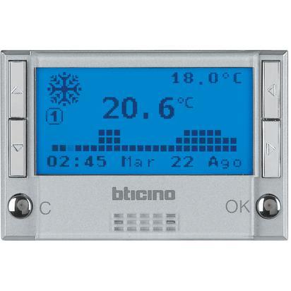 Flush-mounted daily-weekly chronothermostat for heating and air conditioning. Three selectable temperatures in 24 h Auto manual operation Holiday antifreeze. Backlit display battery power supply 2x 1.5 V teleactivable through remote control possibility of connecting an external probe output changeover contact 53 A tech