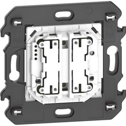Dual wireless light controller equipped with two buttons for controlling two different connected devices to control lights. Each individual button can be associated with one or more devices. Surface installation with repositionable stickers provided or on recessed boxes. Built-in LED for low battery indication. Battery power supply 3 V type CR2032 supplied with 8 years autonomy 2 modules.