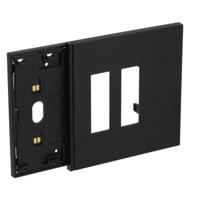 Electrified frame with Italia double socket badge, for installation of 1 digital control and 2 sockets compatible articles KG4033, KG4002, KG4113, KG4180. Installation in 3-module box with K4703 bracket. Black color.