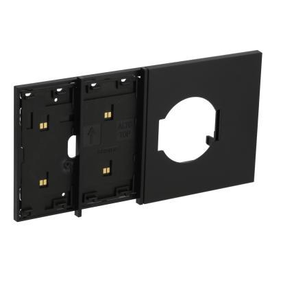 Electrified frame with Italian and German standard socket badge, for installation of 2 digital controls and a 2PT socket compatible articles KG4140A16, KG4140A16F. Installation in 4-module box with K4704 bracket. Black color.