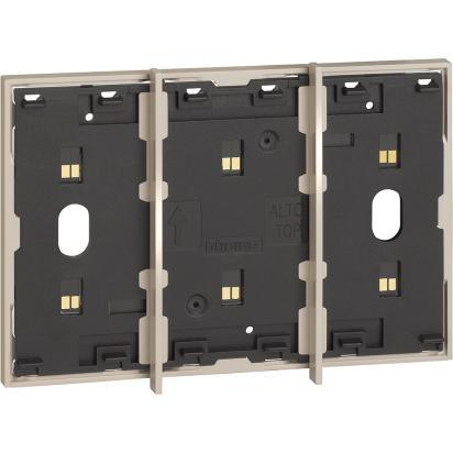 Electrified frame with removable aesthetic dividing bars between controls. For installation of up to 3 digital controls or cover art. KWKGKM8100. Installation in 3-module box with K4703 support. Sand color.