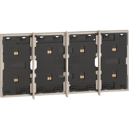 Electrified frame with removable aesthetic dividing bars between controls. For installation of up to 4 digital controls or cover art. KWKGKM8100. Installation in 3-module box with K4703 support. Sand color.