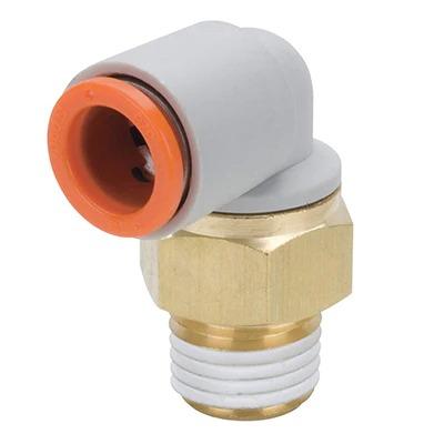 ONE-TOUCH FITTING, SERIES KQ2, WHITE BODY, LIGHT GRAY RELEASE, MALE ELBOW/UNION/PLUG-IN/REDUCER, 3/8 INCH TUBE OD, 3/8 NPT PORT SIZE, BRASS THREAD, WITH THREAD SEALANT
