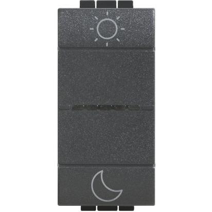 Wireless scene control equipped with 2 buttons for activating Night and Day scenarios customizable from the Home Control app. It can be installed in any recessed box without any wiring. The battery can be replaced without removing it from the stand. Integrated LED for low battery warning. Battery power supply 3 V type CR2032 supplied with 8 years autonomy 1 module Device supplied packaged with finishing badges in white, tech, anthracite colors.