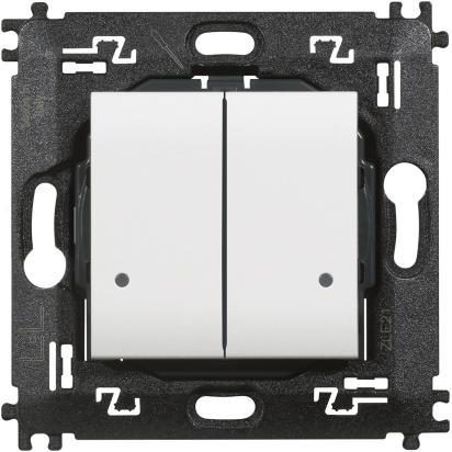 Dual wireless light controller equipped with two buttons for controlling two different connected devices to control lights. Each individual button can be associated with one or more devices. Surface installation with repositionable stickers provided or on recessed boxes. Built-in LED for low battery indication. Battery power supply 3 V type CR2032 supplied with 8 years autonomy 2 modules.