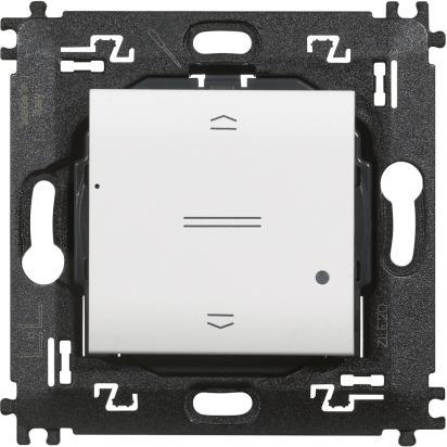 Wireless shutter control. Allows control of one or more connected shutter controls. Surface installation with repositionable stickers provided or on recessed boxes. Built-in LED for low battery indication. Battery power supply 3 V type CR2032 supplied with 8 years autonomy 2 modules