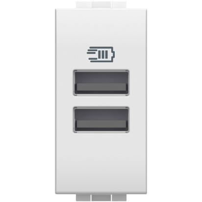 USB charger with two Type A ports for charging a single electronic device up to 15W or two devices simultaneously. Output voltage 5 Vd.c. DIRECT power supply 100240Va.c. 5060 Hz 1 module White