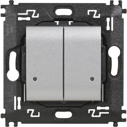 Dual wireless light controller equipped with two buttons for controlling two different connected devices to control lights. Each individual button can be associated with one or more devices. Surface installation with repositionable stickers provided or on recessed boxes. Built-in LED for low battery indication. Battery power supply 3 V type CR2032 supplied with 8 years autonomy 2 modules.