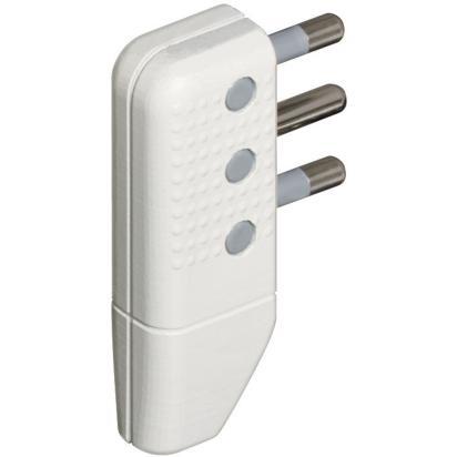 Space-saving 2PT 16A square corner plug with in-line or square swivel pins in white. Sold in blister packs 90x122 mm WxH
