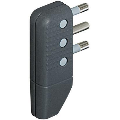 Space-saving 2PT 16A square corner plug with in-line or square swivel pins in anthracite color. Sold in blister packs 90x122 mm WxH