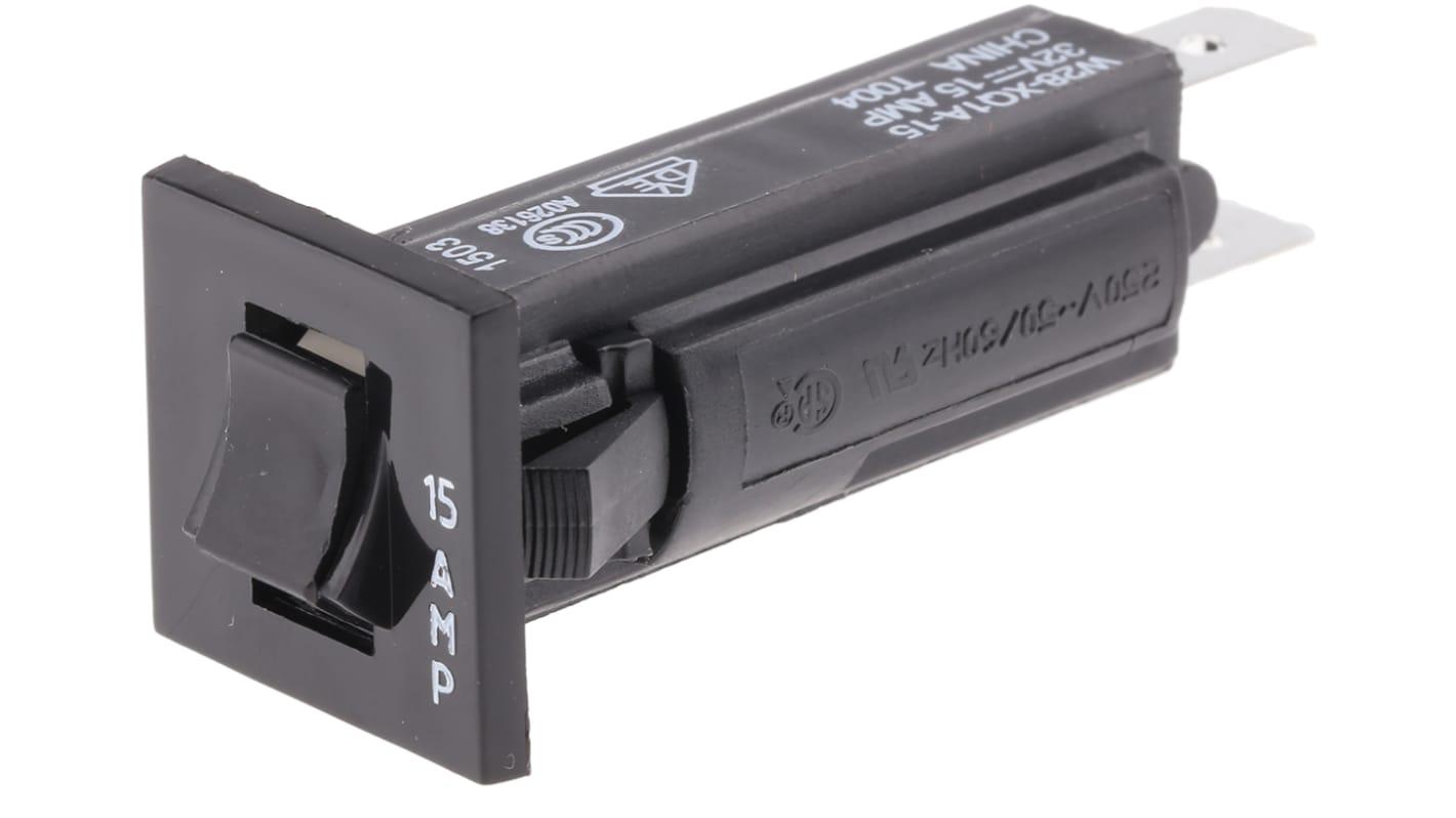 Circuit Breakers, Thermal, Series Trip, Black, Operating Voltage 250 VAC, Operating Voltage 32 VDC, 15A Current Rating, 1 Pole, Potter & Brumfield W28; Alias: W 28XQ1 A15, W28-XQ1A15 W28-XQ1A-15=W28-