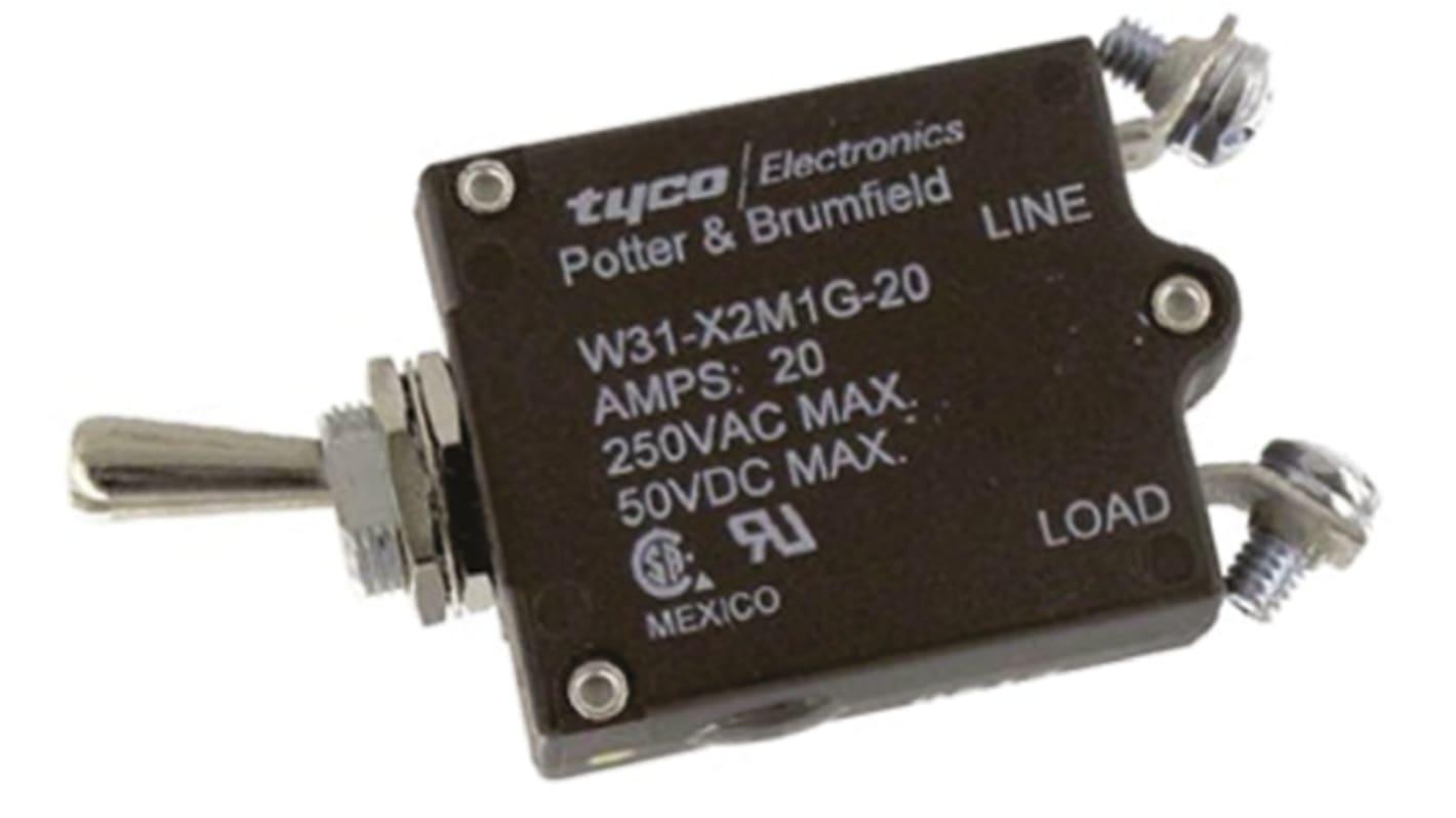 Circuit Breakers, Thermal, Series Trip, Silver, Operating Voltage 240 VAC, Operating Voltage 50 VDC, 20A Current Rating, Potter & Brumfield W23-31 Alias: W31-X2M1G-20=W23/W31