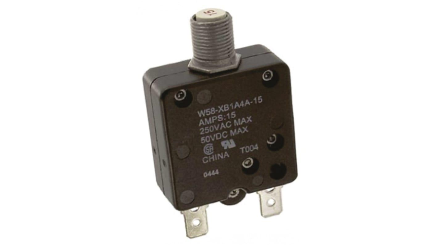 TE Connectivity W58 thermal circuit breaker, 1 pole pole, 15A, 50V dc, 250V ac Alias: W58-XB1A4A-15=W58